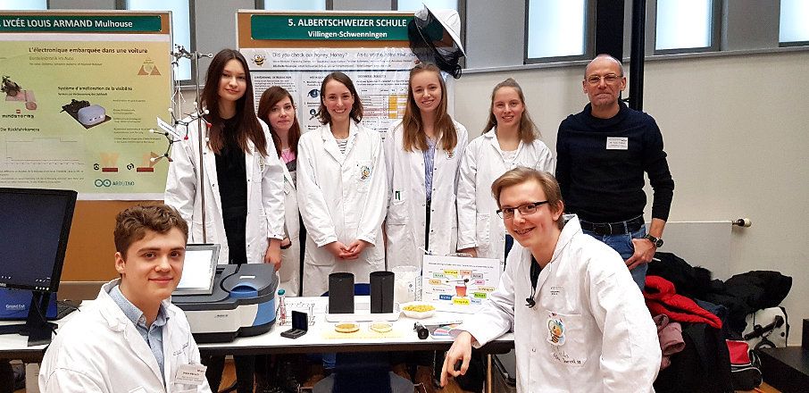 Die Bienensaison 2020 ist wieder im vollen Gang. Aktuell wurde schon der erste Honig dieses Jahres vom ASS-Dach geholt. Hier nun eine Nachlese zum Thema Honigqualität im Bienenjahr 2019. Die AG-Biotechnologie hat sich in diesem Schuljahr die Frage gestellt, wie man die Qualität von Honig im Labor zweifelsfrei bestimmen kann. Dabei sollte natürlich auch der ASS-Honig der letzten Saison mit getestet werden. Im Laufe des Projekts wurden neue Methoden im BTG-Labor etabliert und die Ergebnisse auf dem Trinationalen Schülerkongress in Freiburg zu Beginn des Jahres vorgestellt. Alle Schülerinnen und Schüler haben mit viel Eigeninitiative eine Powerpoint-Präsentation einstudiert und den Vortrag auf dem Kongress sehr überzeugend präsentiert.