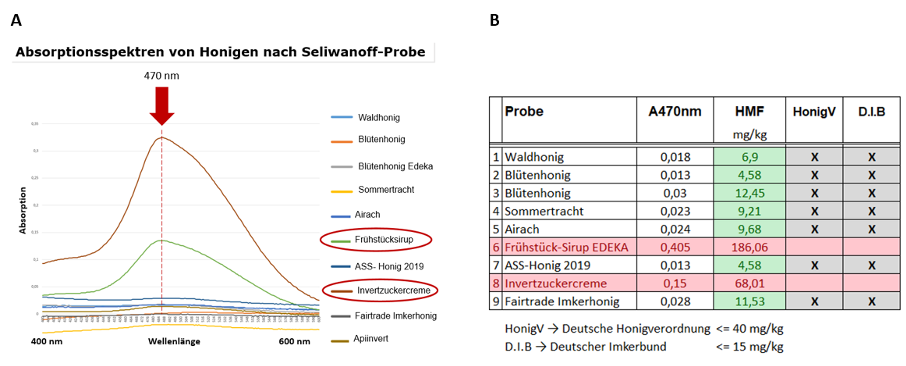 Abb. Photometer-Absorptionswerte (A) und daraus berechnete HMF-Werte (B) für die verschiedenen Honigproben.